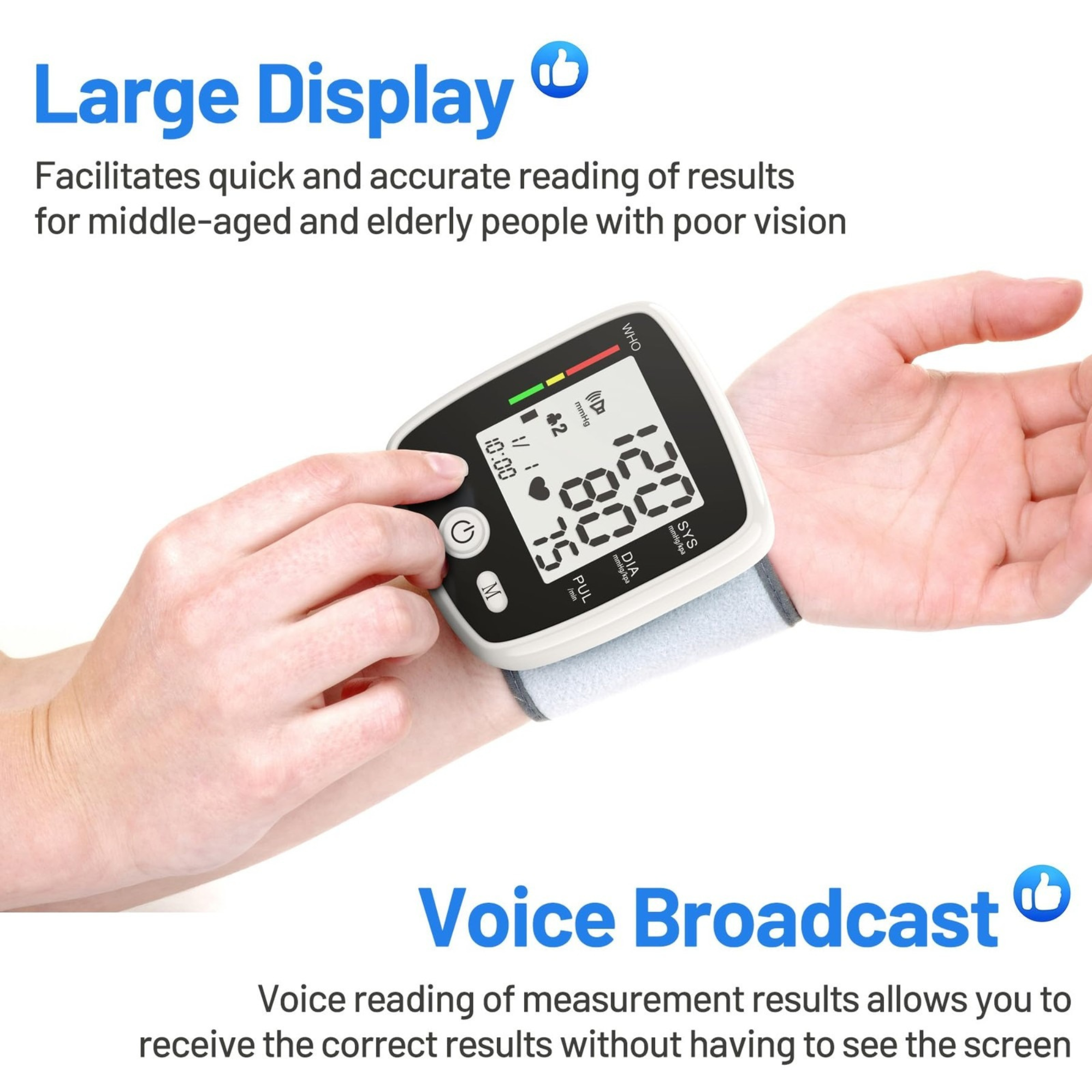 • This blood pressure monitor with the large LCD display is easy to read. Simply tie the cuff around your wrist. Your measurements will appear on the LCD display within a minute and the unit will read your results after diagnosis.