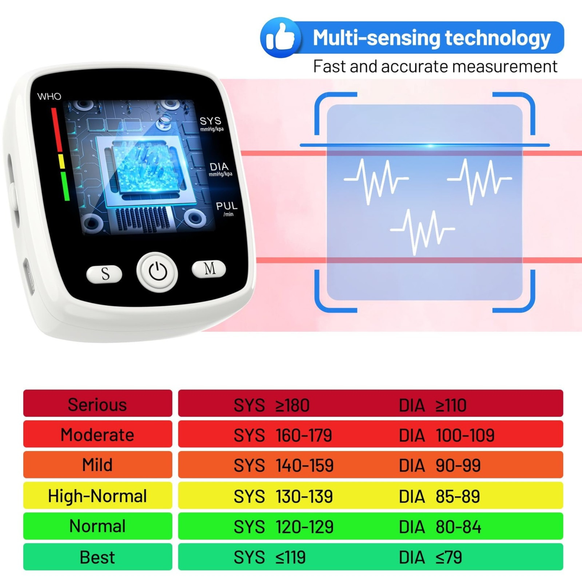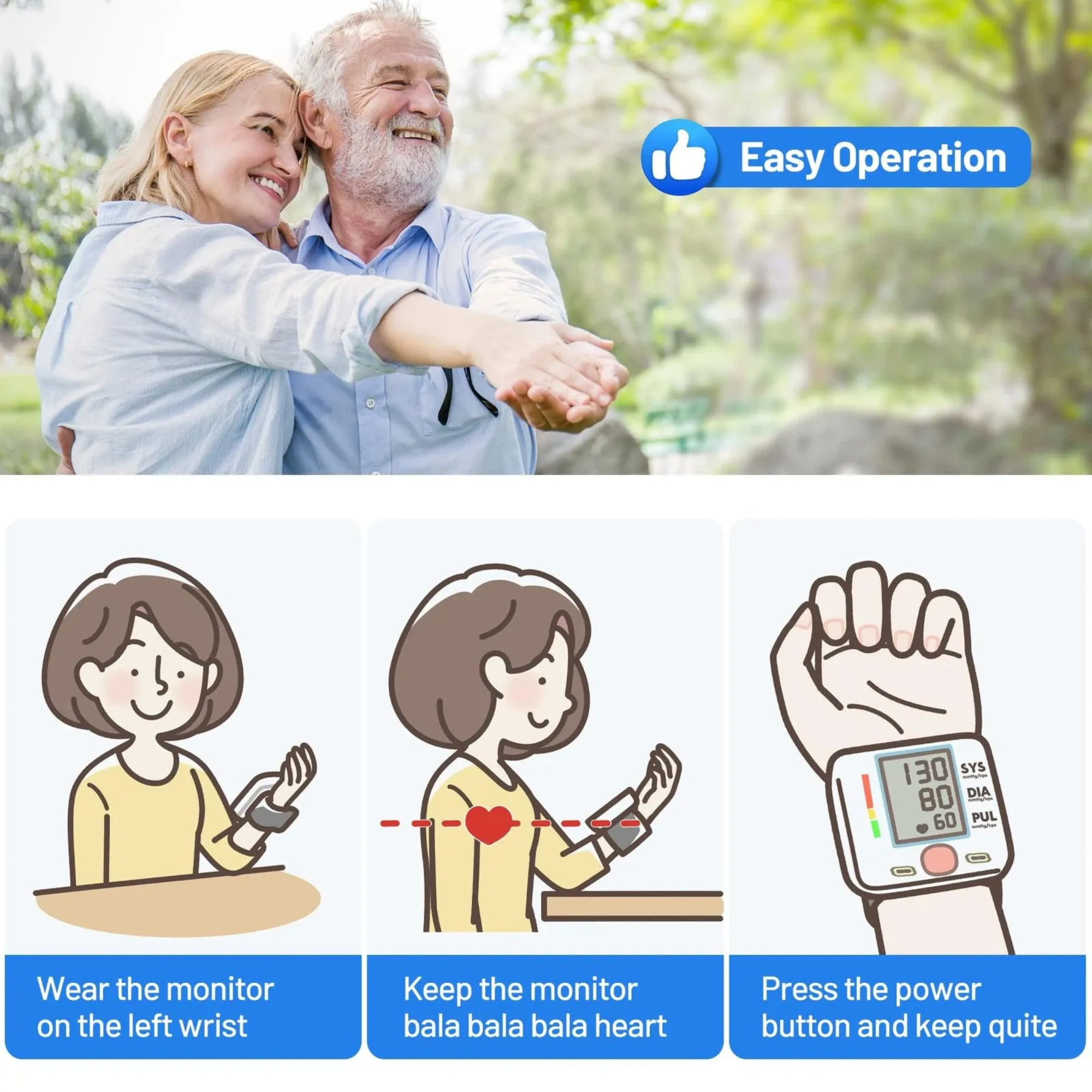 • The arm-style wrist blood pressure monitor is fully automatic and can measure your blood pressure and heart rate with just one "start" button. Just keep your blood pressure cuff wrist and heart level, and the whole process only takes half a minute.